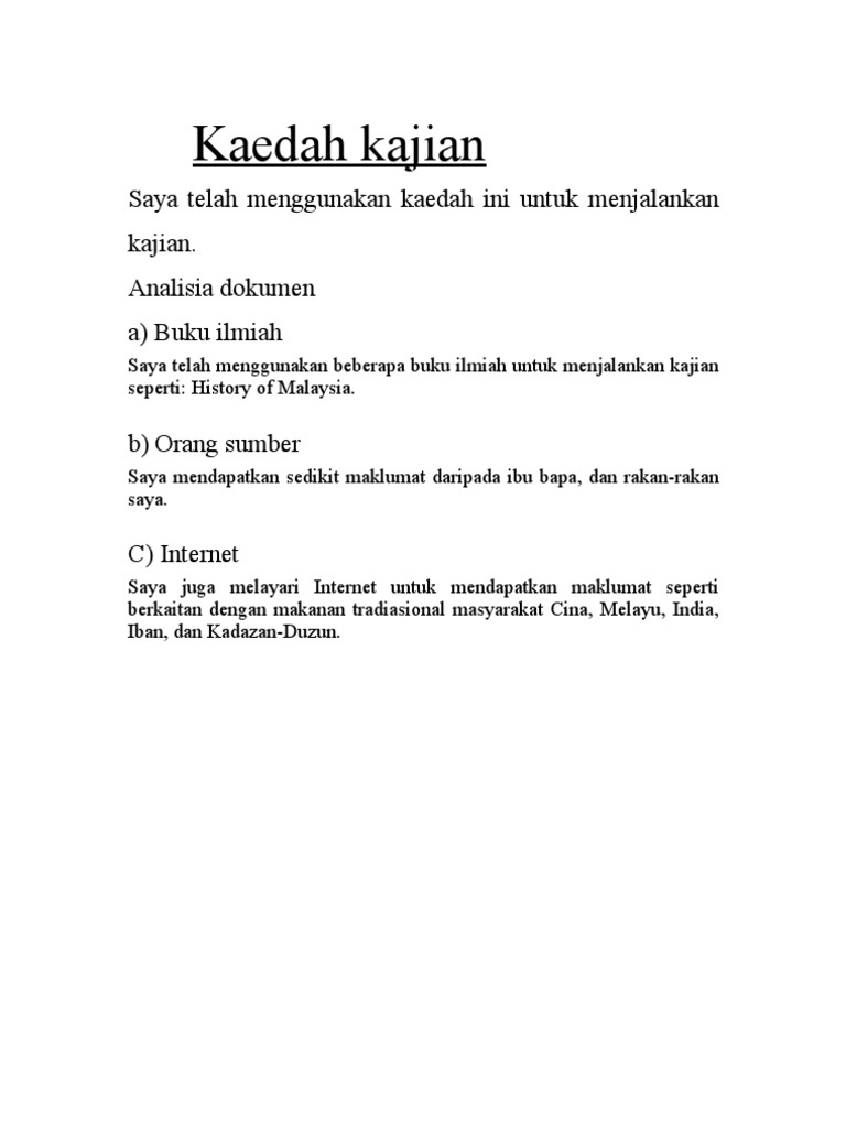 Kajian juga ingin menganalisis faktor-faktor yang menyebabkan perniagaan makanan segera sering menjadi pilihan pelajar. 40 KAEDAH KAJIAN Menurut Penerbit Universiti Sains Malaysia daripada Konsep Asas Penyelidikan dan Statistik dalam Praktis Kesihatan Izham Ibrahim 2004 kaedah kajian ialah sebarang aktiviti yang dilakukan untuk meningkatkan pengetahuan seseorang. Contoh Kaedah Kajian Masyarakat Di Tempat Tinggal AndaPanduan buat pelajar Tingkatan 3 PT3 yang sedang menyiapkan tugasan Sejarah tahun 2018 yang bertajuk Kajian Tentang Masyarakat Di Tempat Tinggal CalonBerikut dikongsikan senarai Contoh Kaedah Kajian Tugasan Sejarah PT3 2018 atau kaedah yang diguna pakai dalam menyiapkan isi kandungan tugasan kerja Kursus folio Sejarah.