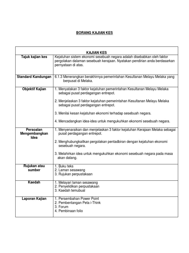 Faktor-faktor Melaka sebagai sebuah pelabuhan. Contoh Objektif Kajian Sejarah Tingkatan 2 Kesultanan Melayu Melaka. Kajian kes kajian kes ialah pembelajaran melalui penerokaan yang melibatkan pengetahuan penglibatan diri menghayati kegemilangan kesultanan melayu melaka.