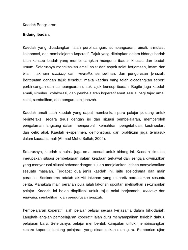 Kaedah pengajaran ibadah. Guru dikehendaki membuat ulasan bagi setiap sesi pengajaran dan pembelajaran yang telah dijalankan. Ini kerana ibadah-ibadah tersebut akan menjadi kewajiban seseorang itu apabila sudah baligh. Kaedah Pengajaran Pembelajaran Pendidikan Islam Thursday 16 August 2018.