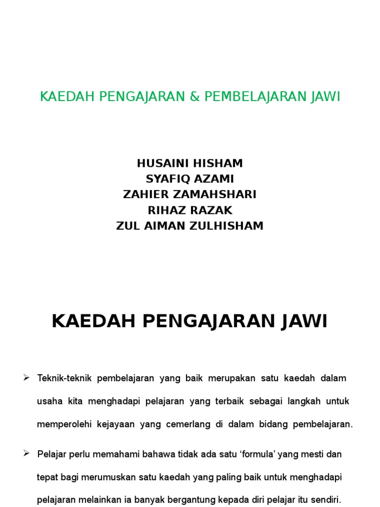 Copy link Link copied. Kaedah pengajaran Jawi yang disarankan oleh pihak Kementerian Pendidikan Malaysia KPM dan telah diberi pendedahan secara khusus kepada bakal-bakal guru Pendidikan Islam dan j-QAF Kementerian Pelajaran Malaysia 2006. Kaedah pengajaran mendengar-bertutur kaedah membaca menulis kaedah memerhati.