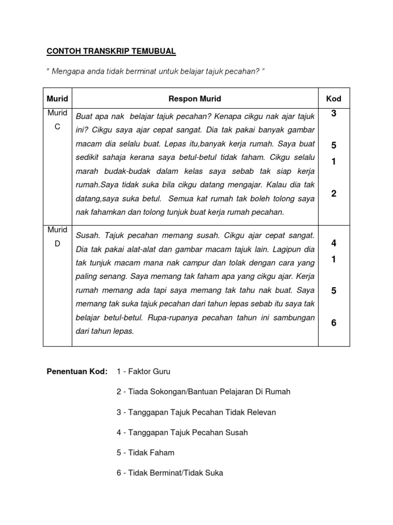Temu bual perlu bersifat reflektif dan dapat mencerminkan kehidupan dan. Contoh dapatan kajian temubual kerja kursus pengajian am 2015 melalui kaedah temubual bersertakan borang soal selidik yang diedarkan kepada penduduk setempat saya dapat mengumpul maklumat berhubung dengan beberapa perkara seperti berikut. 50 dapatan kajian dan perbincangan bahagian ini menerangkan keputusan analisis data berdasarkan tindak balas responden terhadap mengenal pasti amalan adat memandikan bayi dalam kalangan.