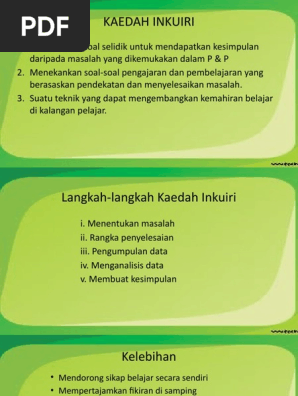 Mampu meningkatkan inkuiri dan pemikiran kritikal murid Supramani 2008. Pembelajaran inkuiri merupakan kegiatan pembelajaran yang melibatkan secara maksimal seluruh kemampuan siswa untuk mencari dan menyelidiki sesuatu benda manusia atau peristiwa secara sistematis kritis logis analitis sehingga mereka dapat merumuskan sendiri penemuannya dengan penuh percaya diri. Kaedah pengajaran merupakan cara yang digunakan untuk mengelola dan menggunakan teknik isi pelajaran dan alat bantu mengajar untuk mencapai objektif pengajaranTeknik pengajaran pula ialah kemahiran atau caramelaksanakan penyampaian bahan pengajaran kepada murid dari segi langkah-langkah dalam aktiviti pembelajaranSecara khususnya teknik merupakan satu cara.