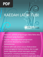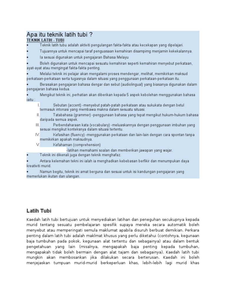 Hasil analisis menunjukkan kaedah latih tubi dapat membantu mengurangkan kesilapan menulis huruf kecil k dan p dua orang murid Tahun Empat. TEKNIK LATIH - TUBI. Tatabahasa diajar secara menghafaz beberapa ayat asas melalui ajukan dan maknanya diberi dalam ungkapan biasa dalam bahasa ibunda.