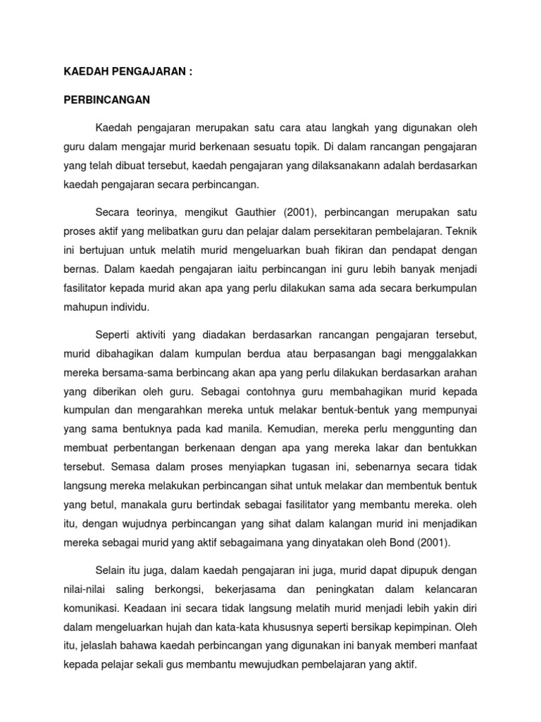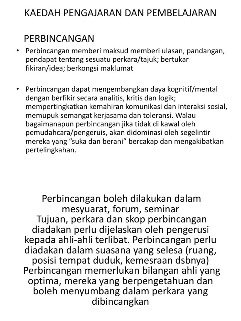 Pengalaman sebagai pendidik guru dan nazir sekolah memebrikan gambaran bagaimana kaedah pengajaran yang berlaku di sekolah dalam negara kita. 811533 Strategi perbincangan STRATEGI PERBINCANGAN Definisi Menurut Killen 1947 perbincangan merupakan proses berinteraksi secara bersemuka di mana pelajar dapat bertukar-tukar idea membincangkan atau. Teknik-teknik pengajaran adalah kemahiran atau perkara-perkara khusus yang terdapat dalam sesuatu kaedah.