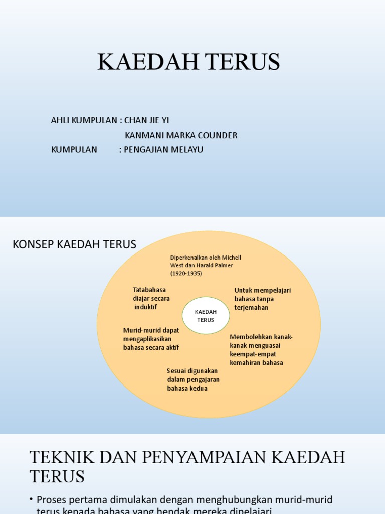 Kaedah mengikut Kamus Dewan bermaksud cara atau aturan membuat sesuatu hukum atau prinsip. Menurut Salleh Mohd Akib 1975 kaedah terus ini ialah kaedah pengajaran secara perbualan untuk memperkenalkan bahasa kedua kepada kanak-kanak.
