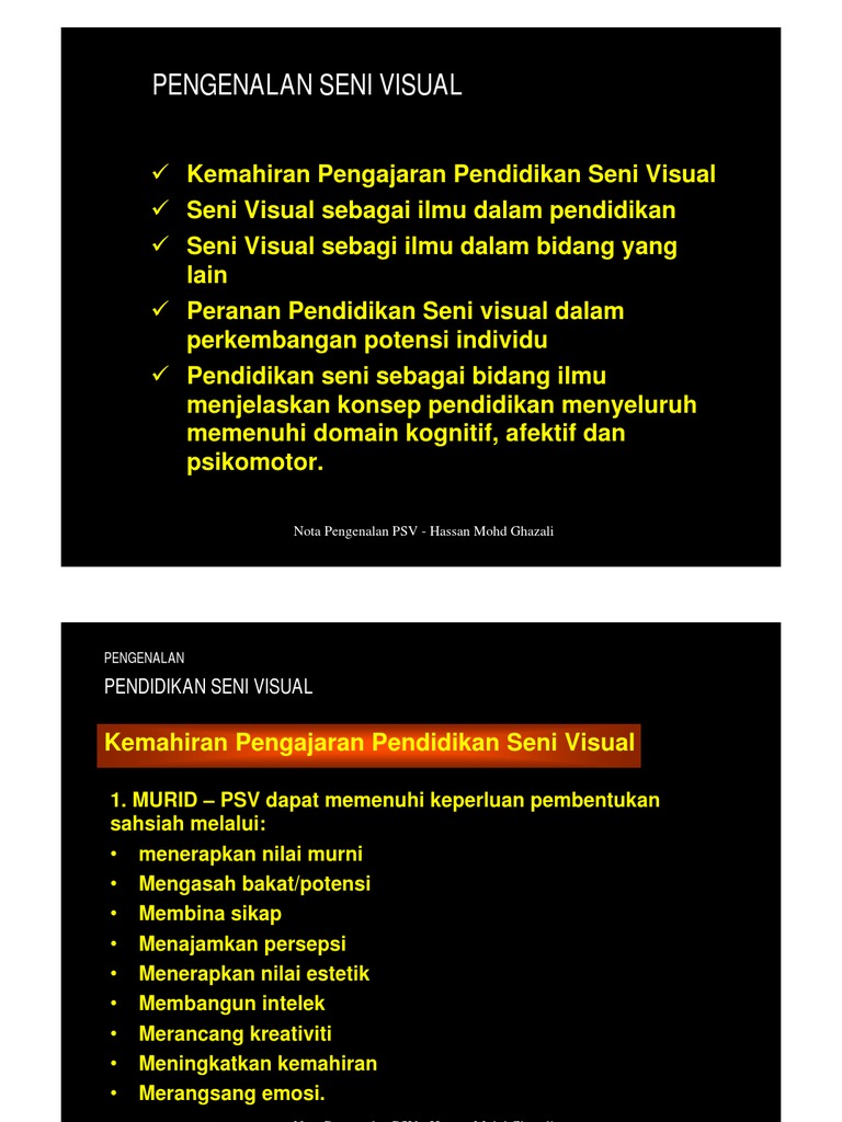 Kaedah pengajaran pendidikan seni visual. ALIZA BINTI ANTHONY ABET ALIZA BINTI ANTHONY ABET 2009 Komitmen guru pendidikan seni visual minor kursus perguruan lepas ijazah dalam pengajaran pendidikan seni. Kaedah Pengajaran Pendidikan Seni Visual Aspek afektif juga boleh dinilai oleh guru semasa menggunakan kaedah pemerhatian. Melalui kaedah pengajaran yang responsif terhadap budaya ini guru boleh mengajar Pendidikan Seni Visual sambil memasukkan elemen budaya atau unsur-unsur kesenian daripada kaum India dan Cina semasa mengajar kraftangan masyarakat Melayu misalnya.