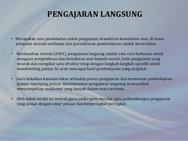 Dengan demikian strategi pengajaran tidak mlangsung ini dapat menggalakkan pemahaman pembelajaran yang sebenar-benarnya. Model ini berarahkan guru dimana guru akan menyampaikan isi pengajaran secara langsung kepada murid-murid serta menstruktur masa pengajaran supaya menyusun langkah pengajaran dan pembelajaran. Masalah penguasaan jawi di kalangan murid-murid menjadi isu hangat yangdiperkatakan.